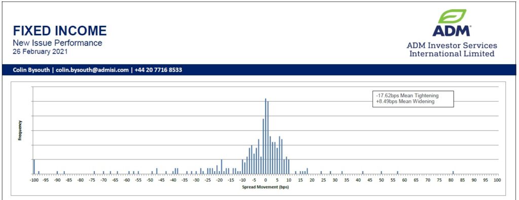 Of the 294 bonds (with price and spread data populated) in the performance table for the past month, 170 tightened and 124 widened. The average tightening was -18bps and the average widening was +8bps.