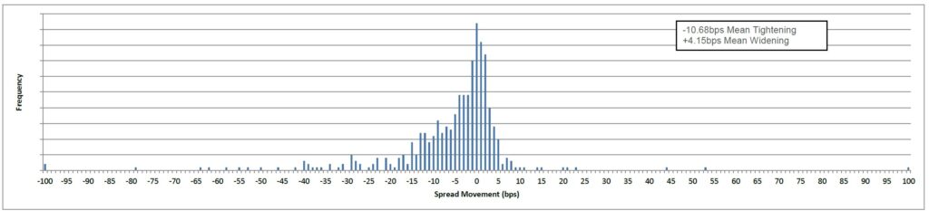 Of the 416 bonds (with price and spread data populated) in the performance table for the past month, 264 tightened and 152 widened. The mean tightening was -11bps and the mean widening was +6bps.