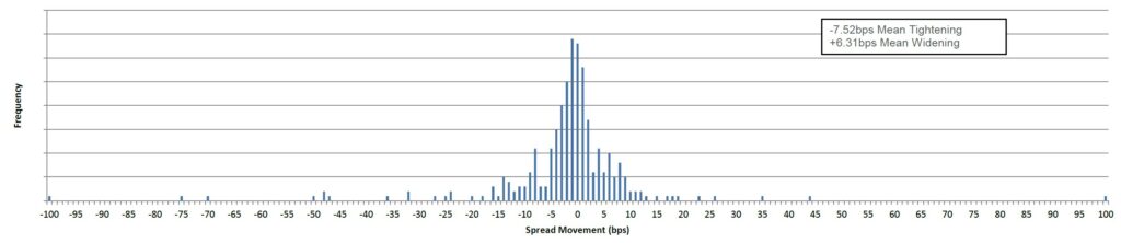 Of the 310 bonds (with price and spread data populated) in the performance table for the past month, 198 tightened and 112 widened. The mean tightening was -8bps and the mean widening was +6bps.