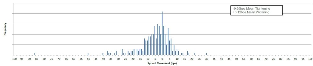 Of the 258 bonds (with price and spread data populated) in the performance table for the past month, 180 tightened and 78 widened. The mean tightening was -10bps and the mean widening was +5bps.