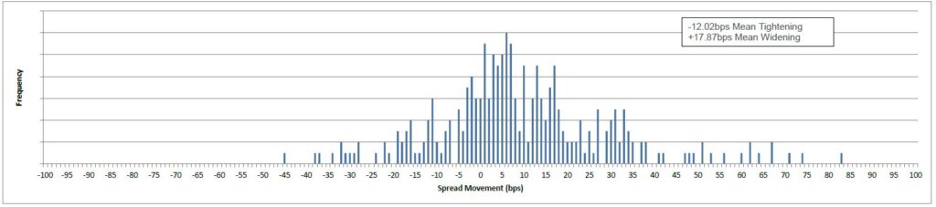 Of the 291 bonds (with price and spread data populated) in the performance table for the past month, 86 tightened and 205 widened. The mean tightening was -12bps and the mean widening was +18bps.