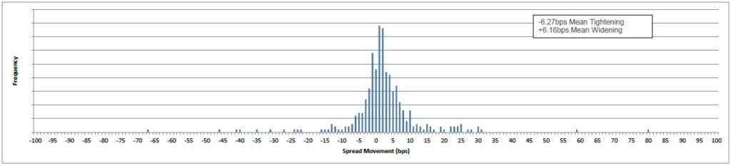 Of the 343 bonds (with price and spread data populated) in the performance table for the past month, 127 tightened and 216 widened. The mean tightening was -6bps and the mean widening was +6bps.