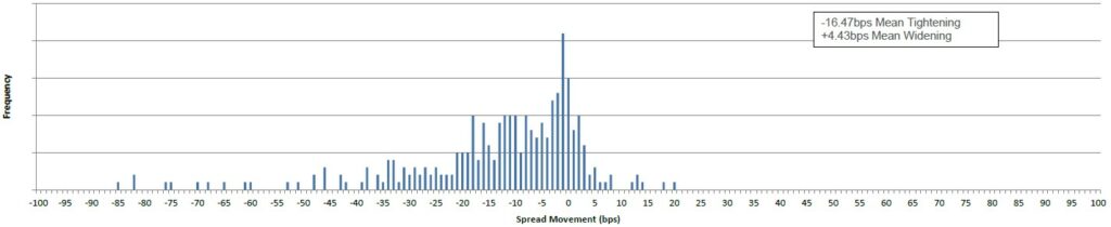 Of the 293 bonds (with price and spread data populated) in the performance table for the past month, 254 tightened and 39 widened. The mean tightening was -16bps and the mean widening was +4bps.