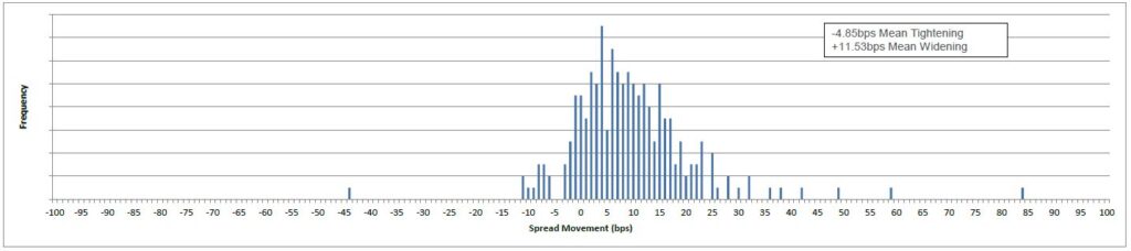 Of the 236 bonds (with price and spread data populated) in the performance table for the past month, 39 tightened and 197 widened. The mean tightening was -5bps and the mean widening was +12bps.