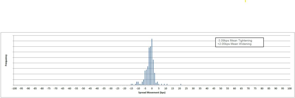 Of the 218 bonds (with price and spread data populated) in the performance table for the past month, 174 tightened and 44 widened. The mean tightening was -3bps and the mean widening was +2bps.