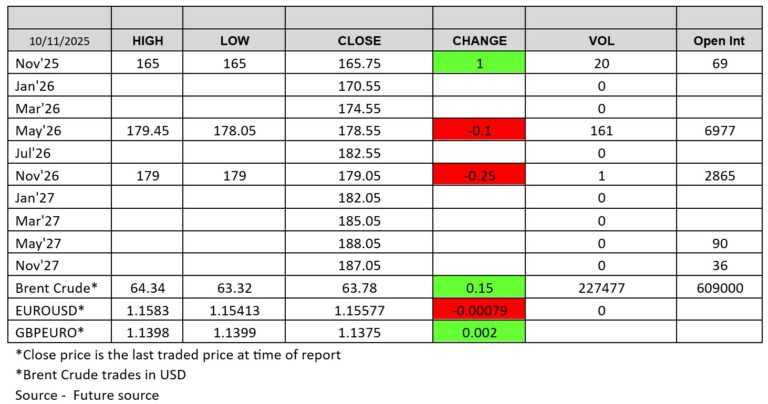 London started the week with a lackluster display less than 100 lots went through on screen. 49 lots were retendered on Nov 5 and the open interest has climbed again; it now stands at 69.  Today £165.00 traded on the Nov 25. May 6 traded slightly down on the day.