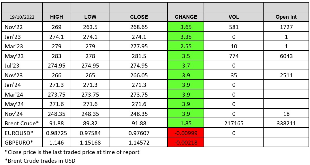 London settled up around £3.50 through the majority of the traded months. Mar 23 traded ten times to add to the already huge open interest of……1 lot. Across London wheat today the most traded month was May 23 with 774 lots trading as an outright, but interestingly it was followed closely by November 22 which is coming ever closer to the tender period. 581 lots crossed the line as an outright and a number of Against actuals/EFPs will surely see the open interest in this contract fall into hundreds, off the 1727 reported by ICE yesterday.