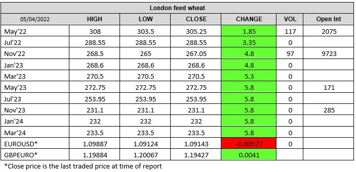 Wheat tenders were back in force. Following on from the Saudi tender yesterday, Bangladesh purchased 50kt of Indian wheat and Jordan has re-entered their tender for 120kt milling wheat. Iraq bought 100kt of alleged German origin milling wheat and Lebanon has secured a loan from the World Bank of $150m to secure 6 months of wheat. Chatter about Russians bombing infrastructure in Odessa continues. More chatter about the risk of floating mines in the major Black Sea shipping lanes that have come loose or weren’t secured properly in a true Soviet ‘slam em in’ style. Both sides accuse each other of laying mines. London marine insurance brokers have already put Black Sea and Azov on the high risk area. Matif May-22 settled up €0.75 on yesterday at €364.50/t.