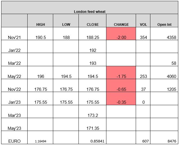 US markets were closed today for Labour day. European wheat futures under pressure, with both Paris and London drifting lower. It was a relatively slow day with the US markets closed and traders awaiting the WASDE crop estimates later this week, due on 10th September. Paris Dec-21 milling wheat settled down €2.25/t on Friday at €244.50/t. Data from clearing house LCH showed storage certificates for 141,000t of wheat had been submitted so far for physical delivery against the September contract. Traders are continuing to assess French wheat quality with French traders now chasing German milling wheat, with some traders offering to pay €10/t over Paris Dec-21 for milling wheat for September delivery (Reuters). After Algeria reportedly eased test weights, traders are watching to see how large volumes of wheat due to be shipped to China would be executed. UK feed wheat futures followed Paris, Nov-21 settling down £2.00/t on Friday at £188.25/t. UK harvest continues to roll with farmers trying to catch up with the dry weather forecast.