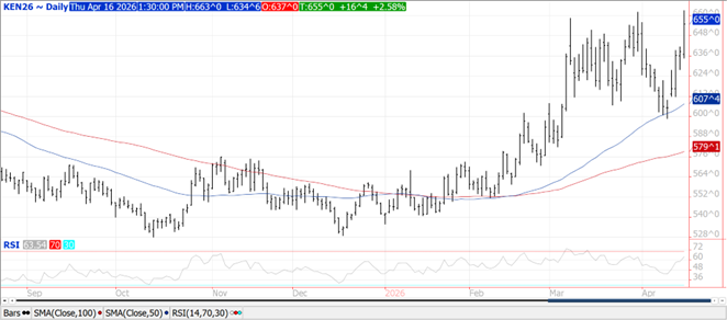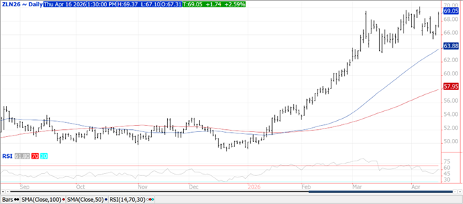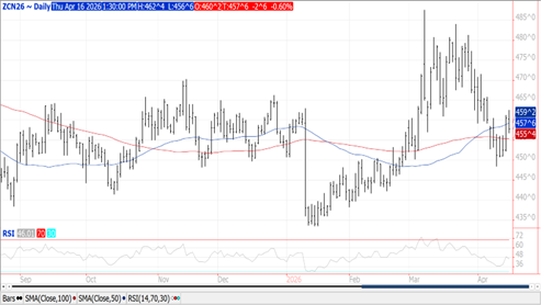Prices pulled back late settling $.01-$.03 lower.  Spreads also weakened.  July-26 closed back below its 50-day MA with next support at the 100-day MA at $4.55 ½.  Dec-26 was down $.01 ¼ at $4.76 ¾.  Plantings in the SE half of the Midwest are moving along at a rapid pace while little activity in the soaked northern Midwest.  Yesterday’s ethanol production at 329 mil. gallons was above expectations as processing margins remain robust.  While speculative traders were healthy buyers of nearly 18k contracts yesterday, O.I. in corn fell by just over 10k.  Export sales at 57 mil. bu. were in line with expectations and brought old crop commitments to 2.866 bil. bu. up 29% from YA, vs. the USDA forecast of up 15.5%.  Commitments represent 87% of the USDA forecast, above the historical average of 83%.  Noted buyers were Japan–16 mil., Korea–13 mil. and Mexico–7 mil.  The BAGE raised their Argentine production forecast 4 mmt to 61 mmt, well above the USDA est. of 52 mmt, however still below the Rosario Grain Exchange est. of 67 mmt.