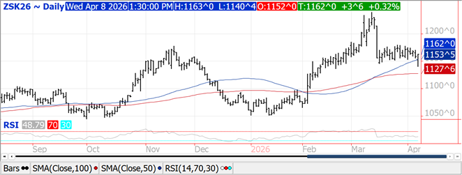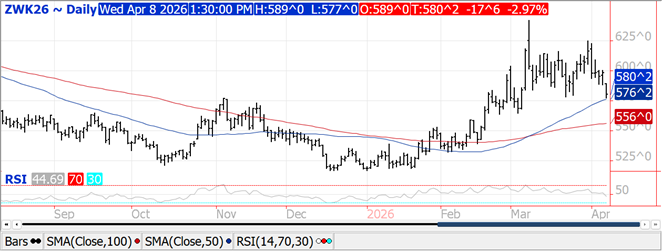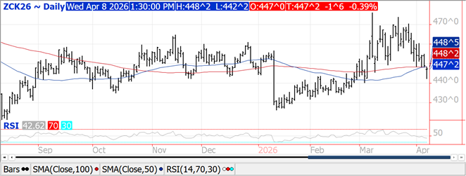 Prices rebounded late closing only $.01-$.02 lower.  Nearby spreads firmed despite today being the day 1 of the Goldman roll.  The 50/100 day MA’s near $4.48 ¼ now serve as resistance for the May-26 contract.  Support is at the March low at $4.40 ¼.  Support for Dec-26 is at $4.67. Ethanol production rebounded to 1,116 tbd, or 328 mil. gallons in the week ended Fri. April 3rd, up from 316 mil. the previous week and 9% above YA.  Production was above expectations.  There was 110 mil. bu. used in the production process, or 15.73 mil. bu. per day, above the 15.4 pace needed to reach the USDA forecast of 5.60 bil.  In the MY to date there has been 3.289 bil. bu. used, or 15.3 mbd, an annualized pace of 5.584 bil.  Ethanol stocks ticked up to 26.1 mil. barrels, below the 27 mb from YA.  Implied gasoline demand slipped 1.4% to 8.564 tbd, however was up 1.6% from YA.  Tomorrow’s export sales are expected to range between 35-65 mil. bu.