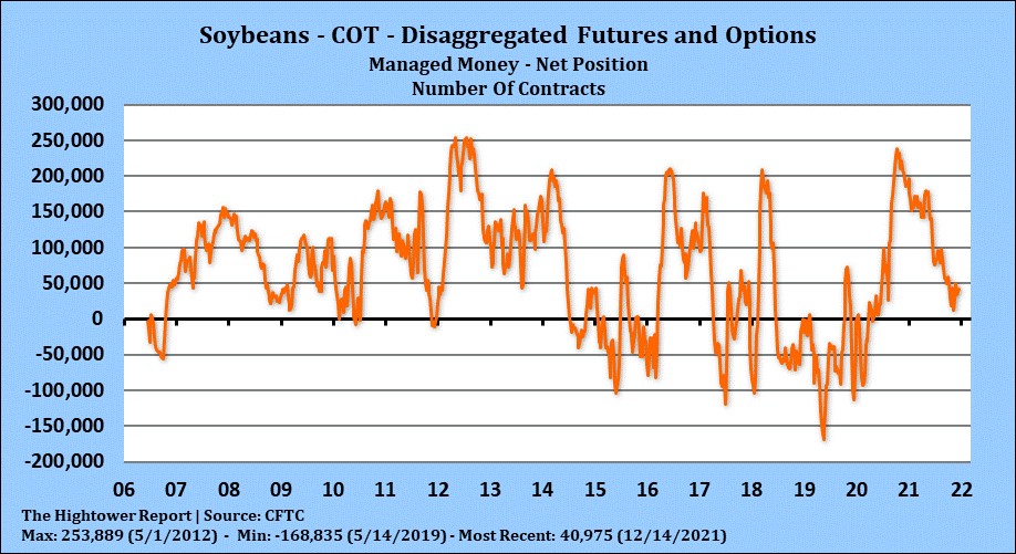 Soybean ended higher. A drier than normal South Brazil and NW Argentina 2 week weather forecast triggered new buying. That triggered technical buying in soybeans and soymeal. Noon Central Brazil maps added some rain. If realized. This could add uncertainty to the long range forecast. Parana Brazil lowered their 2022 soybean crop 4 mmt to 57 mmt. Some feel this could drop the Brazil soybean crop to 141 mmt vs USDA 144. Another crop watcher lowered his Brazil soybean crop to 142 mmt with a range of 136-144. He lowered Argentina soybean crop to 49.0 mmt vs USDA 49.5. Funds were net buyers of 9,000 soybeans, 5,000 soymeal and 4,000 soyoil. We estimate Managed funds to be net long 71,000 soybeans, 49,000 soymeal and 55,000 soyoil. Record long was for soybeans 253,800 5/2012, soymeal 133,500 5/2018 and soyoil 126,000 11/2016.