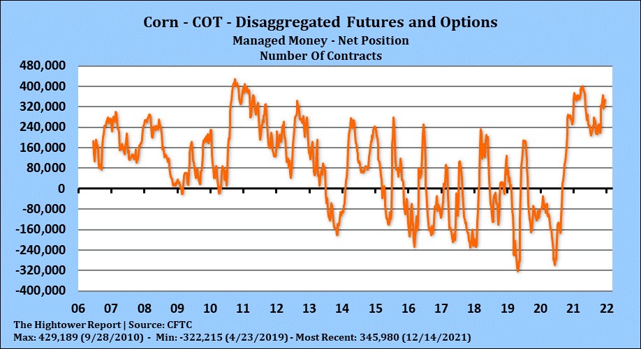 Wheat futures traded higher. WH may have ran out of new selling near 7.50. KWH may have also found support near 7.80. US south plains dryness supports KC futures. Some est 2022 HRW crop at 737, carryout 191. Same analyst est US 2022 wheat crop at 1,825 carryout 470. RMA US winter wheat acres were lower than est. China continues to buy Australia wheat. Now 5 mmt. Export capacity max until May, 2022 Russia export tax is near $122.50. Could reach $142.50. Exports now estimated near 31 mmt vs USDA 36. Close over 8.44 KWH could suggest a test of 9.00. Wheat futures also found support from talk that Omicron virus despite spreading quickly may be weaker than the Wuhan and Delta virus. US government continues to stress non vaccinated to get vaccinated and booster and continue to practice common sense washing hands, wear mask when necessary and try to avoid crowds inside. Managed funds are estimated to be net short 1,000 Chicago wheat contracts. Their record long was 80,800 contracts in August, 2012.