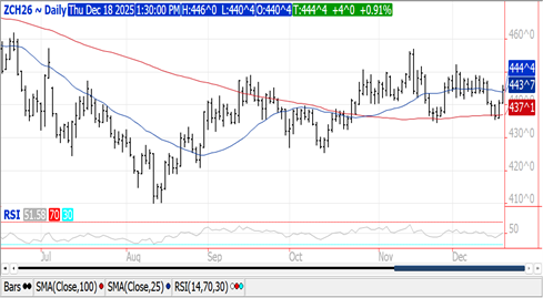 Prices were $.02-$.04 higher however nearby spreads weakened. Mch-26 futures jumped out to new highs for the week while closing near its 50 day MA at $4.43 ¾. Prices continue to hold in a $4.35-$4.55 range. MM’s bought 34k contracts of corn in the week ended Dec. 2nd, flipping their net position back to net long 23k contracts. Export sales for the week ended Nov. 20th at 71 mil. bu. brought YTD commitments to 1.746 bil. bu. up 30% from YA, vs. the USDA forecast of up 12%. YTD commitments represent 55% of the USDA forecast, well above the historical average of 45%. Noted buyers were Japan and Mexico with 18 mil., while Colombia and Mexico bought 7-8 mil. each. China imported 560k mt of corn in Nov-25 (from Brazil), while up 87% from Nov-24 their YTD imports at only 1.85 mmt are off 86% YOY. The EU raised their 25/26 corn production forecast .2 mmt to 57.8 mmt, above the USDA est. of 56.75. US corn acres in drought increased 1% in the past week to 32%.