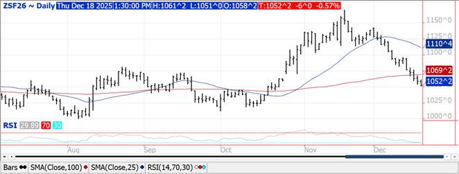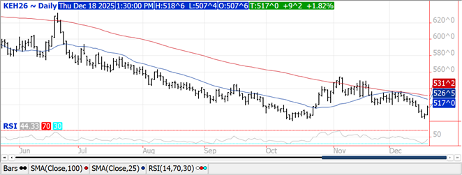 Prices ranged from $.02-$.11 higher with KC and MIAX the leaders to the upside. Chicago futures lagged as Mch-26 premium to corn has fallen to a new 2 ½ low at $.64 bu. Wheat will continue to try and work into feed rations. Spreads in CGO eased while slightly firmer in KC and MIAX. US WW acres in drought increased 2% to 36%, likely to increase further into year end. In the period ending Dec. 2nd MM’s were net buyers of 10k contracts in CGO, 4k in KC and nearly 2k in MIAX. Their combined short position fell to only 81,641 contracts, the lowest in 13 months. I’m sensing the past few weeks they’ve started to pile back into the short side of the market. Export sales at 17 mil. bu. brought YTD commitments to 696 mil. bu. up 23% from YA, vs. the USDA forecast of up 9%. By class commitments vs. the USDA forecast are: HRW up 94% vs. USDA up 49%, SRW up 7.6% vs. up 2.6%, HRS down 5% vs. down 8%, and white up 5% vs. down 10%.