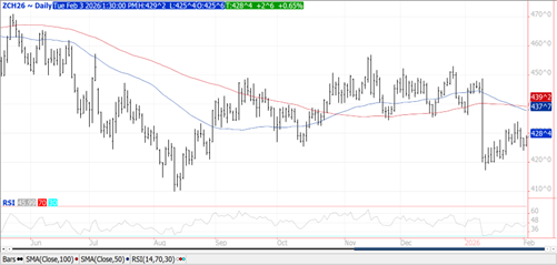 Prices were $.02-$.03 higher with ethanol also likely to benefit from the 45Z guidelines. Spreads also firmed. The Goldman roll for the Mch-26 contracts begins on Friday. Mch-26 remains stuck in a $4.15-$4.40 range. A South Korean feed group bought 134k mt of optional origin feed corn at an average price just below $243.50/mt CF for Spring shipment. There was 488 mil. bu. of corn used for the production of ethanol in Dec-25, while above the average trade guess it was offset by a downward revision to the previous months usage. Dec-25 usage was up 1.8% YOY and brought cumulative usage in the first 4 months of the 25/26 MY to 1.863 bil. bu., up less than 1% from YA vs. the USDA est. of up 3%. Tomorrow’s EIA report could show a sharp drop in ethanol production last week due to the frigid cold. Production estimates range from 265-327 mil. gallons, vs. 327.5 mil. the previous week. Dr. Michael Cordonnier lowered his Argentine production forecast 1 mmt to 53 mmt, which now matches the USDA est. He left his Brazilian forecast unchanged at 137 mmt, well above the USDA est. of 131 mmt. EU corn imports as of Feb. 1st at 10.1 mmt are down 17.6% YOY.