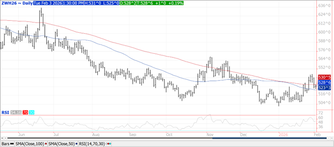 Prices ranged between $.03 lower to $.01 higher. Spreads weakened. CGO Mch-26 appears stuck between its 50/100 day MA’s. KC Mch-26 has MA support near $5.26. Little to no moisture for the plain states this week however both the 6-10 and 8-14 day outlooks look for above normal precipitation. Russian exports in Jan-26 have been trimmed to 2.5-3.0 mmt due to poor weather. Jordan passed on making any purchase in their recent 120k mt tender. EU soft wheat exports as of Feb. 1st at 12.82 mmt equal YA volume. Frigid cold in E. Europe and Russia isn’t expected to have impacted their winter wheat crop as snow cover likely provided adequate insulation.