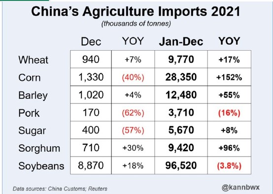Wheat is wheat. The on again off again traded may be limited to the latest Russia and Ukraine headline. Post US and Russia talks in Geneva may have relieved some of the War bulls for a while. This weighed on wheat futures today. KC is gaining on Chicago and MLS. There remains increase concern about dryness across US HRW south plains. USDA reported that 96 pct of TX, 81 KS, 95 OK. 100 CO and 92 pct NE soils are dry. Our weather guy sees continued dryness through Feb. NOAA 90 day forecast calls for below rains and above temps for US HRW. US wheat export commit is below pace to reach USDA goal. Weekly US wheat export sales were 380 mt. Total export commit is 16.5 mmt vs 21.3 ly. USDA goal is 22.4 vs 27.0 ly. World wheat buyers ae short. USDA est of EU and Russia wheat exports may be too high. EU wheat is the lowest to buyers especially vs US HRW. China imported a record 9.8 mmt of wheat in 2021 and continues to sell wheat from reserves. Much of this is for feeding.