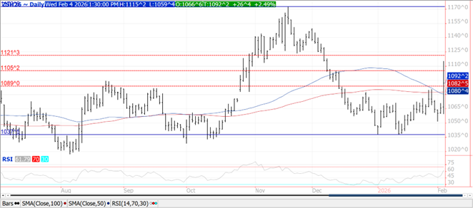 Corn futures are higher and near 4.85. Rally remains tech related and supported by increase demand for US corn. Delay in Brazil corn planting is also supportive. USDA is estimating World 2024/2025 corn crop at 1,214.35 mmt vs 1,230.0 ly. The drop is due to USDA lowering Jan est of the US crop. US crop is now 377.6 mmt vs 389.6 ly. USDA est Brazil crop at 127.0 mmt vs 122.0 ly. They also est Argentina at 51.0 vs 50.0 ly and Ukraine at 26.5 vs 32.5 ly. China crop is est at 294.9 mmt vs 288.8 ly. Of the total World end stocks of 293.3, China is 206.1. Trump is talking about an across the board 2.5 pct tariff that could increase over time. Newly approved US Sec of Treasury is in agreement with the new tariff that could be imposed as early as this weekend. Grain trade trying to digest the impact of this new tariff.