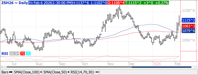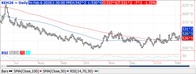 Soybean futures are higher and near 10.61. SH is back above 10.50 with resistance near 10.75. Rally led by soymeal. Rally remains tech related and supported by drier South Brazil and Argentina forecast. Delay in Brazil soybean harvest is also supportive. Bears trying to hold on looking for better SA weather. Weekly US export sales are est at 600-1,800 mt vs 1,490 last week. Total commit is near 42.0 mmt vs 38.0 last year. Total US soybean use is est at 4,349 mil bu vs 4,105 ly. US export are est at 1,825 vs 1,695 ly. Crush is est at record 2,410 mil bu vs 2,287 last year. Some est 2025/26 US crush at 2,650 and exports at 1,600.