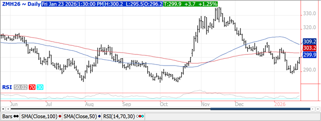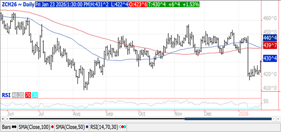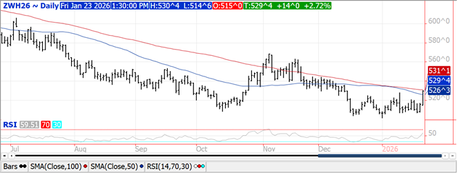 Prices ranged from $.01 to $.15 higher with KC and CGO the upside leaders. CGO Mch-26 traded to its highest level in a month, stalling just below its 100 day MA at $5.31. KC Mch-26 held below this month’s high at $5.44 ¾. Mch-26 MIAX closed just above its 50 day MA. This weekend’s winter storm will help ease drought readings in the SE plains. US winter wheat acres in drought increased 1% to 42% this past week hovering just below its 52 week high of 45%. Export sales at 23 mil. bu. were above expectations bringing YTD commitments to 768 mil. bu. up 18% from YA, vs. the USDA forecast of up 9%. Commitments represent 85% of the USDA forecast, above the historical average of up 80%. Perhaps we’ll see a bump up in Feb-26. Russia’s Ag. Ministry held their export tax at zero thru at least Feb. 3rd.