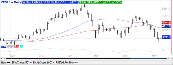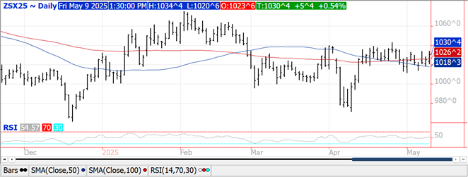 Prices were $.03-$.04 higher in choppy 2 sided trade.  Conab raised their Brazilian production forecast 1.7 mmt to 115.86 mmt, still below the USDA est. of 122 mmt however in line with expectations.  Still no updates from the BAGE.  Exports at 26 mil. bu. were at the low end of expectations.  Old crop commitments at 2.137 bil. still up 37% from YA vs. the USDA forecast up 29%.  Columbia, Japan and Mexico all bought 7-8 mil. bu. of old crop while nearly all of the new crop sales were to Mexico.  New crop commitments at 143 mil. bu. are a 5 year low.  Yields have been cut 4 times in the past 20 years, most recently last year when down 4 bpa.