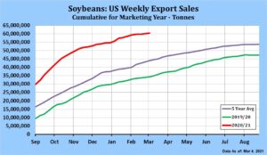 Wheat traded lower. Concern about demand for US wheat exports and talk of good rains across the US HRW wheat areas weighed on prices. Market is also seeing net selling after USDA failed to lower EU and Russia wheat exports on their March report. Egypt bought Romanian wheat in their tender. US export prices are not competitive to N Africa and Mideast buyers. Matif and Black Sea wheat futures traded lower. USDA estimates US 2020/21 wheat carryout at 836 mil bu. Most private groups est US 2021 wheat crop near 1,832 mil bu and 2021/22 carryout near 705. Weekly US wheat sales were near 329 mt. Total commit is near 24.1 mmt vs 23.6 ly. USDA goal is 26.8 vs 26.3 ly. US prices are not competitive for N Africa or Mideast buyers. Consumer demand remains strong for US bakers. USDA est World wheat trade near 197.6 mmt vs 190.4 ly. Russia 39 vs 34, EU 27 vs 38 and Austrália 22 vs 9. WK traded below 6.40 support. Next support 6.20.