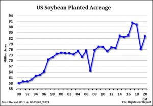 Soybeans, soymeal, soyoil, new crop corn and wheat traded lower. US stocks were higher. US Dollar was lower. Gold was higher. US central bank now sees the economy growing 6.5% this year, and the unemployment rate falling to 4.5% by year’s end. Soybeans traded lower on improving US and South America weather and in front of US weekly export sales. Sales are est near 0-400 mt vs 350 last week. Seasonally, US exports slow and buyers switch to Brazil. Some report China bought 3 US cargoes his week and are 70 percent covered in May and 60 in June. This suggest they may need to buy 6 mmt. China soymeal prices traded higher as hog producers returned as buyers. A year ago nearby soybeans were near 8.00. Next key issue is USDA March 31 report. May nee a US weather problem to make new highs.