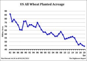 Wheat futures traded lower. Rains across US south plains continues to weigh on prices. Slow demand for US exports also offers resistance. From the Feb high near 6.88 WK has dropped to a low near 6.30. KWK Has dropped from 6.64 to 5.90. MWK has dropped from 6.58 to 6.30. It remains dry across US north plains. Weekly US wheat export sales are est near 150- 500 mt vs 329 last week. Next key USDA report is March 31 acres and stocks report. In April most feel USDA will make few changes to US/World wheat supply and demand. USDA est US 2020/21 wheat carryout near 836 mil bu vs 1,028 ly. HRW stocks near 383 vs 506 ly, SRW 99 vs 105 ly and HRS 258 vs 280 ly. Early guess forUS 2021 wheat is near 1,900 mil bu with a carryout near 790. USDA continues to est World wheat end stocks near 301 mmt vs 300 ly and a crop near 776 mmt vs 764 ly. Some are est World 2021 crop near 780 mmt.