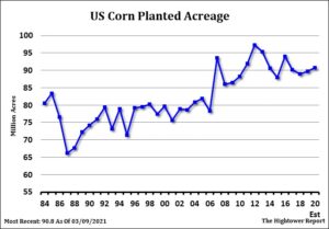 Soybeans, soymeal, soyoil, new crop corn and wheat traded lower. US stocks were higher. US Dollar was lower. Gold was higher. US central bank now sees the economy growing 6.5% this year, and the unemployment rate falling to 4.5% by year’s end. Soybeans traded lower on improving US and South America weather and in front of US weekly export sales. Sales are est near 0-400 mt vs 350 last week. Seasonally, US exports slow and buyers switch to Brazil. Some report China bought 3 US cargoes his week and are 70 percent covered in May and 60 in June. This suggest they may need to buy 6 mmt. China soymeal prices traded higher as hog producers returned as buyers. A year ago nearby soybeans were near 8.00. Next key issue is USDA March 31 report. May nee a US weather problem to make new highs.