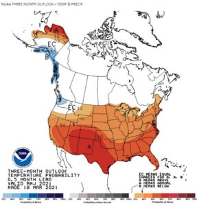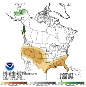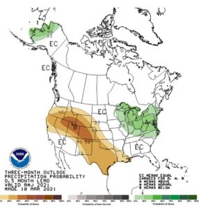 Wheat futures traded sharply lower. WK traded back to near the 100-day moving average support level. Nearby Chicago wheat futures have not traded below that levels since December. Higher US Dollar and lower energy prices may be an indication of delayed increase in food and fuel demand especially in EU. US Fed comments could shift money back into equities and bonds. Weekly US wheat sales were near 14 mil bu. Total commit is near 900 mil bu vs USDA goal of 985. Rains in US south plains and slow demand for US export is offering resistance to futures. Uncertainty over Russia 2021 crop size and export policy offers support. Last year, WK lost the inverse to WN going into first notice. Talk of increase global wheat feeding could offer support. NOAA US 30-day outlook calls for above normal temps and below normal rains in west and SW. 90 day calls for above normal temps and below normal rains in south US. This could stress US HRW and HRS crops.