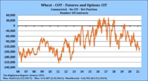 Wheat futures managed small gains before USDA report. Some feel managed funds could be liquidating short wheat futures and short wheat spread before quarter end and USDA report. Most so not look for big surprises in the wheat numbers but wheat futures have seek steep losses from Feb 24 high and could be oversold. Most look for weekly USDA weekly winter wheat crop ratings to improves from last week but 2 week weather forecast is dry. Crop will need to see additional rains to insure above average yields. Trade is looking for US 2021 all wheat acres near 45.0 versus 44.3 ly. Winter wheat 31.8 versus 30.4 last year. Spring wheat 11.6 versus 12.2 last year. Concern is that north plains weather could be drier than normal. Trade est March 1 wheat stocks near 1,272 mil bu versus 1,415 last year. Quarterly food use is est near 237 mil bu vs 236 ly, feed -18 vs -19 last year and exports 211 vs 235 ly.