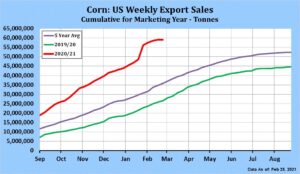 Corn futures closed lower. Some post US weekly corn export sales buying supported prices to near session highs. Higher US dollar and lower US stocks may have triggered long liquidation into the close. Seasonal drop is new US corn export sales may have weighed on CN-CZ spread. This week some analyst suggested nearby corn longs move to CZ. Increase South America harvest pressure and approaching US spring planting season could offer resistance. Weekly US corn sales were near 115 mt. Total commit is near 59.1 mmt versus 26.6 last year. China shipments are near 7.0 mmt with 18.7 mmt total commit and there is 5.8 mmt in unknown. USDA US corn export goal is 66.0 mmt vs 45.1 last year. Our US March weather forecast is warm and wet. April forecast is warm with normal rains. By the end of April US 2021 corn crop should be planted. Early guesses for US 2021 corn planted acres is near 93.0-94.0 million. That could produce a crop near 15,330-15,575 mil bu. If demand is near 15,200 US 2021/22 carryout could be 1,210-1,500. Trade estimates US 2020/21 corn carryout near 1,470 mil bu vs USDA 1,502. Some private estimates are as low as 1,100. World corn stocks are est near 284.1 mmt versus USDA 286.5. Trade est Brazil corn near 108.3 mmt versus USDA 109.0 and Argentina near 47.0 mmt versus USDA 47.5.