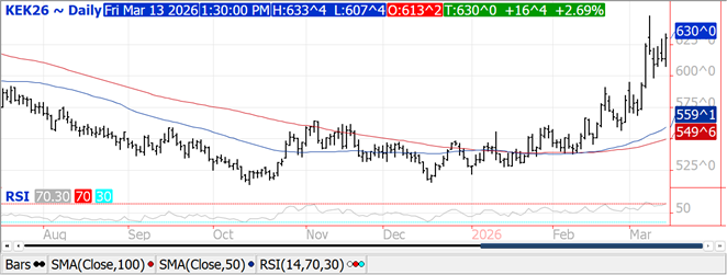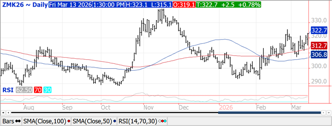 Prices were mixed with beans down $.02-$.06, meal was steady to up $2 while oil closed flat. Spreads were steady to firmer all around. May-26 beans snapped back after trading as much as $.18 lower. May-26 meal had a outside day higher. Spot board crush margins recovered $.07 ½ today to $2.26 ½ while bean oil PV slipped to 51.1%. The BAGE reports Argentine soybean conditions improved 2% to 76% G/E while holding their production forecast unchanged at 48.5 mmt, just above the USDA est. of 48 mmt. Conab lowered their Brazilian production forecast .1 mmt to 177.85 mmt, 1.5 below expectations and compares to the USDA est. of 180 mmt. Yesterday US Treasury Sec. Bessent confirmed he and USTR Greer were meeting Sunday/Monday with Chinese trade officials in Paris, this ahead of the Trump/Xi meeting in Beijing later this month. Speculative buying is pushing MM’s length in the complex close to record levels. Wire services are reporting farmers have been active sellers on the price runup ahead of Spring plantings. Bulls remain hopeful for fresh Chinese purchases despite US Gulf FOB offers pushing out to $1.20-$1.50 over Brazil. News that Cargill has paused Brazilian shipments to China over changes to their inspection procedures has caused that gap to widen. US exports are down 19% YTD vs. the USDA forecast of down 16%. US soybean acres in drought fell 6% to 47%. NOPA crush on Monday is expected to show members processed nearly 203 mil. bu. in Feb-26, down from 221.6 mil. in Jan-26 however well above the 177.9 mil. in Feb-25. Oil stocks are expected at 1.93 bil. lbs. just above the 1.90 in Jan-26 however well above the 1.5 bil. YA.