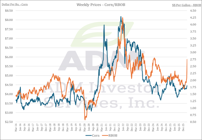 Prices were $.06-$.08 higher closing near session highs.  Spreads were mixed as the nearby May/July made new lows however deferred spreads rebounded.  May-26 jumped to a 4 month high with next resistance at $4.64 ¾.   New crop Dec-26 traded to its highest level in nearly 2 years. Export sales remain strong, up 31% YTD vs. the USDA forecast of up 15.5%.  The BAGE estimates Argentine harvest has reached 7% with early yields averaging 8.1 tons/HA, vs. the USDA yield est. of 7.1.  The BAGE kept their production forecast unchanged at 57 mmt, vs. USDA at 53.  Despite the strength in corn prices this week they didn’t keep pace with surging RBOB prices.