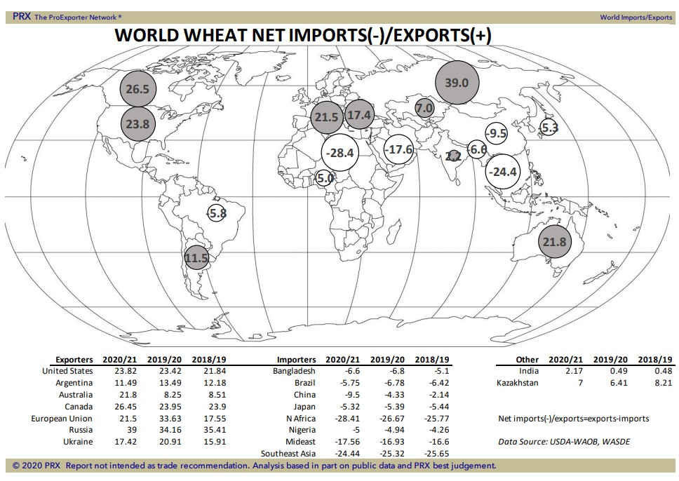 Wheat traded lower. Improved forecast for rains across parts of Canada prairie and US north plains late this week weighed on Minneapolis wheat futures. Lower World wheat prices versus US export prices. Rains in Europe also offered resistance to Matif wheat futures despite low current stocks. Baltic wheat export prices remain lowest. There is concern about global wheat import demand due to slow recover of economies due to virus. Weekly US wheat exports were near 24 mil bu vs 21 last week and 18 last year. Season to date exports are 895 mil bu vs 879 last year. USDA goal including flour is 965 mil bu vs 965 last year. Trade looks for 86 pct of the US 2021 spring wheat planted vs 7- last week. USDA is expected to increase US 2021 winter wheat crop to 50 pct G/E vs 49 last week. Crop scouts will survey the KS wheat crop this week.