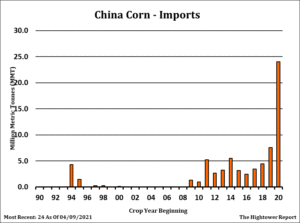 Corn futures continued to rally. Talk of new fund money buying hard assets including corn due to a hedge against inflation is just adding to bullish fundamentals. Fact CN is near 7.32 this early in the crop season suggest demand led rally. CZ near 6.36 could go higher if there is any US summer weather problem. Midwest should see showers over the next 7 days. Day 14 show some ridging in the plains and west Midwest. 43 pct of the Midwest topsoils are short moisture. Trade looks for US corn planting near 70-72 pct. USDA announced 1,360 mmt of new crop US corn sold to China. There is talk that China may now have bought a total of 5-6 mmt new crop US corn. Some feel they may be behind their US new crop buying. China is expected to take all of the 12 mmt of US open unshipped corn sales. Some say the need the corn with talk their corn stocks may be as low as 50 mmt vs USDA guess of 196. Some fear now that Brazil 2021 corn crop may be below 90 mmt versus USDA guess of 109. This could add 400-500 mil bu of additional US 2021/22 corn exports. Trade will be watching to see if USDA lowers Brazil crop, raise China imports, raise US export and lower US carryout on May 12.