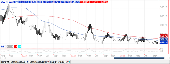 Prices are $.06-$.11 lower across all 3 classes today with all classes trading to fresh 3 month lows. While US wheat areas in drought are expected to keep falling, no significant drought relief is expected for Western Russia, Ukraine and western Kazakhstan over the next week to 10 days. US winter wheat plantings advanced 4% to 91% complete vs. 92% YA and the 5-year Ave. of 93%. Emergence has reached 76% vs. YA and the 5-year Ave. of 79%. 44% of the crop is rated G/E, up 3% from last week and in line with expectations. 18% of the crop is poor or very poor, vs. 23% LW and 17% YA. Russia continues to offer 12.5% wheat at $226/mt FOB for Dec-24 and $230/mt for Jan-25, well below the suggested floor price from their Ag. Ministry of $250/mt. Despite the recent price weakness spreads remain well off their October lows. Chicago Dec-24 premium over Dec-24 corn fell to $1.14 ½ a fresh 8 month low.