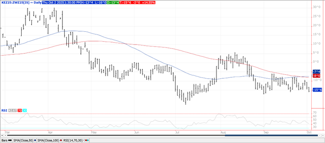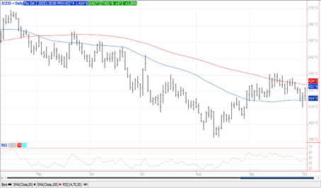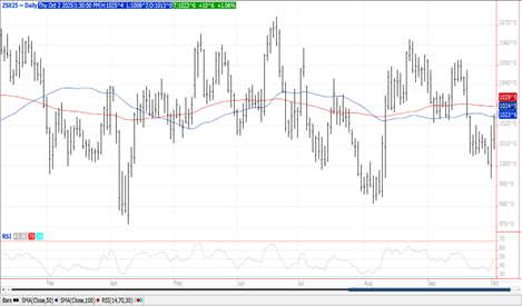 Prices were up $.04-$.05 making session highs in late trade.  Spreads also firmed.  Dec-25 held support above its 50 day MA at $4.14 ½ on early weakness.  Buy stops were triggered upon breaching yesterday’s high.  Resistance rests at the 100 day MA at $4.24 ¼.  Although StoneX lowered their corn yields 1 bu. to 185.9 bpa, their production forecast was up 160 mil. bu. to 16.737 bil. due to higher acres.  Their forecast is still 77 mil. bu. below the USDA forecast from September.  S&P Global also lowered their US corn production and yield estimates to 16.707 bil. bu. with an average yield of 185.5 bpa.  Yesterday speculative traders bought roughly 10K contracts of corn, cutting their short position to 110k.  US corn area in drought rose 2% to 28%.  No CFTC-COT data this Friday with the Fed. Govt. shutdown.