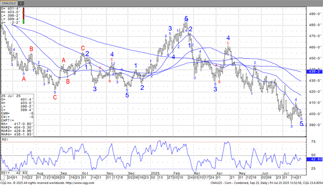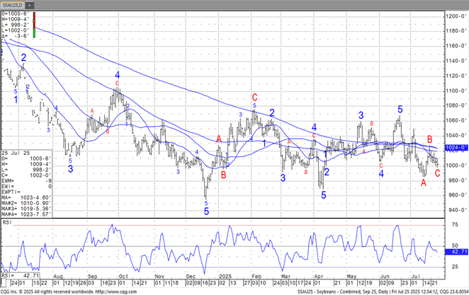 Prices are $.01-$.02 ½ lower today with spreads setting back a bit. Inside trading session for Dec-24. Near term resistance at the Sept-24 high at $4.16, with support at the 50 day MA at $4.04 ¼. Very little rain expected this week for the central and ECB along with the southern plains with much above normal temperatures pushing crops towards maturity. Persistent rains over the NW third of the corn and soybean belt could generate healthy totals over the next 7 days. Export inspections at 21 mil. bu. were at the low end of expectations and well below the 45 mil. bu. needed per week to reach the USDA forecast of 2.30 bil. bu. YTD inspections at 39 mil. are down 24% from YA vs. the USDA forecast of up less than 1%. Mexico was the largest taker at 13 mil. bu. Last week money managers bought just over 44k contracts of corn reducing their short position to 132k, the smallest in 4 months. Since establishing a record short position at nearly 354k contracts 2 months ago they have been net buyers 7 of the past 9 weeks cutting their short position by nearly 222k. AgRural reports 1st crop plantings in Brazil have reached 19%.