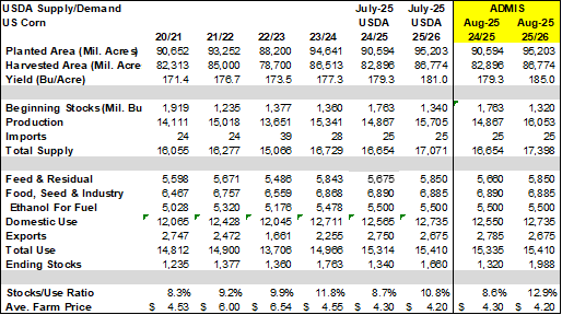 Prices were down $.02-$.03 today while spreads firmed a touch. Dec-24 traded to a fresh 2 month high however failed to challenge resistance at the July high of $4.26 ½. Next resistance is the 100 day MA at $4.30 ½. Support rests at the 50 day MA at $4.04 ½. Hurricane Helene is expected to make landfall along the FL panhandle this evening as a Category 3 storm, perhaps strengthening to a Cat. 4. Sustained winds in excess of 100+ mph is expected to cause significant property and some crop damage. Flooding rains of over a foot in some regions of the SE while 2-3” totals are expected to stretch into SE MO along with southern IL, IN and OH. Little to no moisture for the US plains, WCB and NC Midwest over the next 7 days enabling harvest to accelerate. The USDA announced the sale of 115k mt (4.5 mil. bu.) of corn to Mexico. Exports at 21 mil. bu. were below expectations and bring YTD commitments to 580 mil. bu. still up 17% from YA, vs. the USDA forecast of up less than 1%. Current commitments represent 25% of the USDA forecast, below the historical average of 31%. The only noted buyers last week were Mexico and Columbia both taking just over 6 mil. bu. US corn area in drought fell 1% LW to 25%, still well below the 58% from YA. The Bloomberg survey for next Monday’s USDA report expects Sept. 1 stocks 1.846 bil. bu., up 34 mil. bu. from the Sept. WASDE report and well above the 1.360 bil. from 22/23.