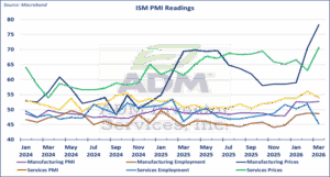 • ISM Manufacturing PMI rose to 52.7 in March, up from 52.4 in February, marking the third consecutive month of expansion. The Prices Index surged to 78.3, its highest since June 2022, reflecting the pass-through of energy costs. ISM Services PMI came in at 54.0, with the Prices Index jumping to 70.7, its highest since October 2022, underscoring inflation pressures across the economy.