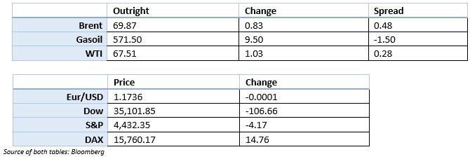 - Market bounced back after a fairly dramatic fall. Second time Brent bounced around the $68 level. Likely that profit taking would be the driver here as little has changed in the outlook.