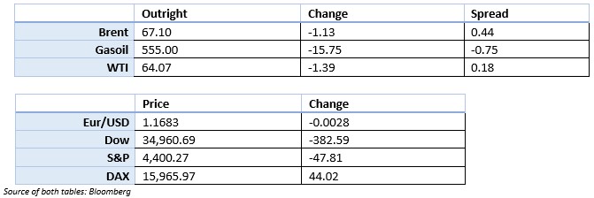 • DOE numbers showed a mixed bag as crude and distillates showed draws, but the unexpected small rise in gasoline caught most of the attention of the market. Gasoline recently had been one of the markets that had shown good demand recently and help push the market upwards, but this build was seen as a potential warning sign of the effect the delta variant could have.