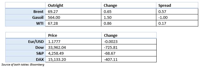 • Market recovering after yesterdays steep fall. Settlement below $70 on brent and WTI and front spread on WTI nearing contango. Brent spreads dropped  57 after trading above 80 in the past 10 days.