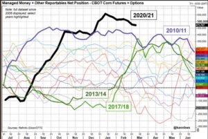 Nearby Chicago corn futures have been stuck in a range for nearly two months after their historic rally that began in August, and speculators continue to cling to their hugely bullish bets, anticipating key supply data from the U.S. government at the end of the month. The U.S. Department of Agriculture on March 9 published its monthly supply and demand report and left domestic balance sheets for corn and soybeans unchanged from the previous month. That added to the overall stagnant mood of the market, but USDA’s March 31 U.S. grain stocks and planting intentions data is expected to make bigger waves.