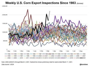 Wire story reports since last year, China has been importing record volumes of U.S. corn due to a supply shortage and record domestic prices. But U.S. shipments to the Asian country have been slightly disappointing in recent weeks, especially following the standout sales streak at the end of January. Total U.S. corn exports have not been dragging, though. Data from the U.S. Department of Agriculture on Monday showed that 2.2 million tonnes of corn were inspected for export in the week ended March 11, the second highest for any week on record. That is only the fourth time since 1983 and the second time this marketing year that weekly U.S. corn inspections, a proxy for exports, topped 2 million tonnes. But only 16% of last week’s corn inspections were destined for China, consistent with the previous three-week average.