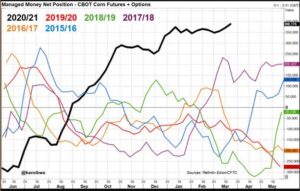 We estimate Managed Money net short 3,000 contracts of SRW Wheat; long 380,000 Corn; net long 138,000 Soybeans; net long 61,000 lots of Soymeal, and; long 70,000 Soyoil.