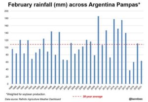 February and March are perhaps the two most important months for Argentina’s corn and soybeans to receive ample rainfall, though last month was unusually dry and this month could follow suit, according to the latest weather forecasts. Yields in the No. 3 corn and soybean exporter are not projected to be great anyhow, though the poor timing of the latest dry spell could reduce potential even further. Crop condition ratings may also be sending mixed and potentially faulty messages to the market.