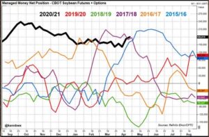 We estimate Managed Money net long 11,000 contracts of SRW Wheat; net long 392,000 Corn; net long 181,000 Soybeans; long 53,000t Soymeal, and; net long 98,000 Soyoil.